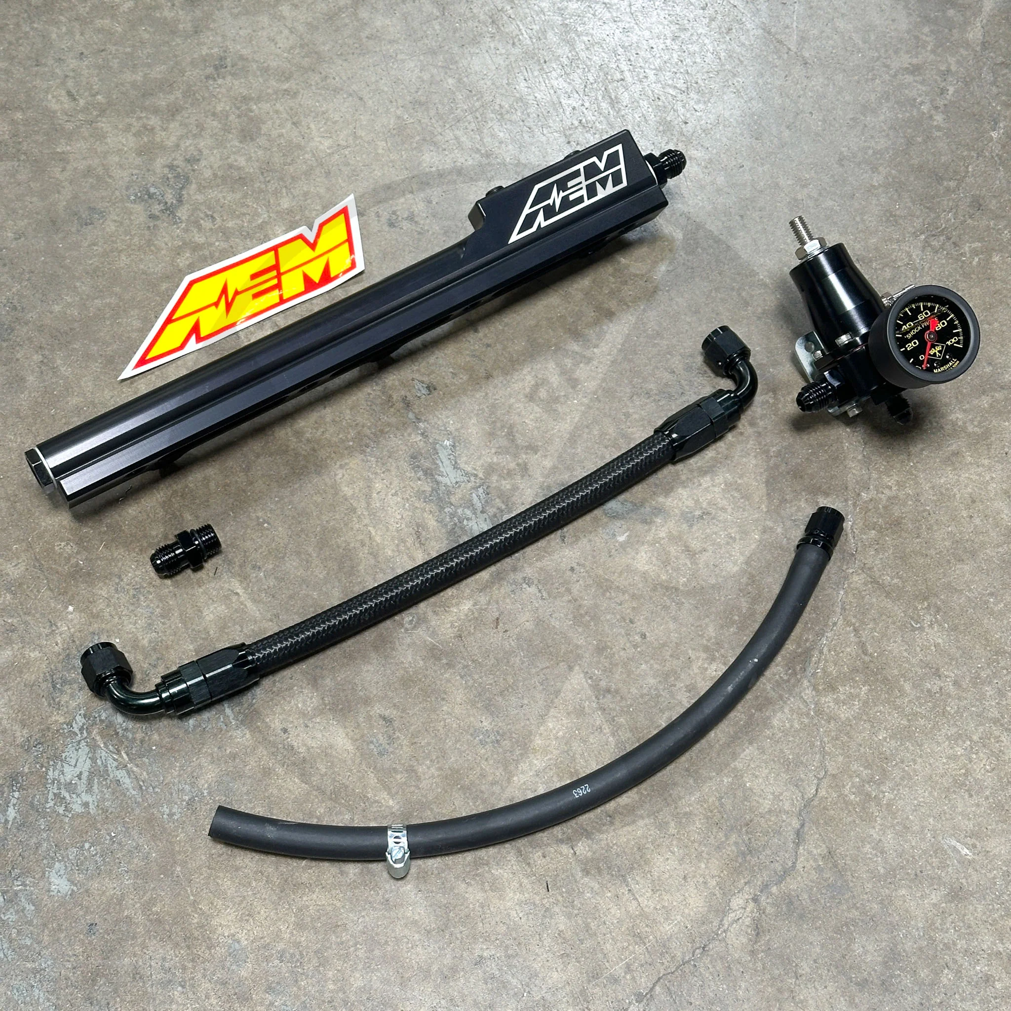 This is a B-Series fuel system, which includes pre-assembled fuel lines, AEM fuel rail, Marshall fuel pressure gauge, and Aeromotive style fuel pressure regulator. Provide your own fuel feed line and save.